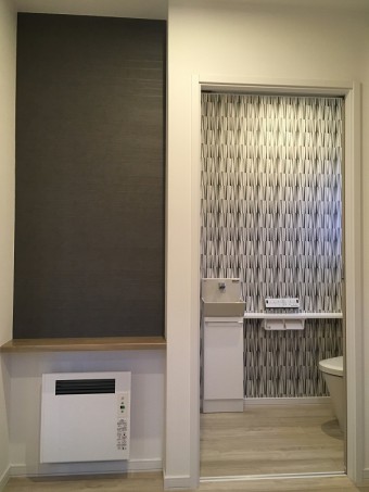 玄関ホールのカウンターと続きのトイレのアクセント壁は少し関連性を持たせて、アーバンテイストな色柄を取り入れてみました。