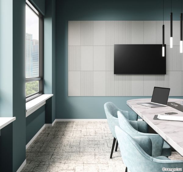 また、市場からの「⾳」に対する開発要望を受けて、反響⾳を吸収してクリアな⾳環境を実現する硬質のフェルトタイル「SOUNDIA(サウンディア)」を開発しました。リサイクルPET材料を約60%配合した低環境負荷商品で、ミニマルなデザインと、軽量で簡単な施⼯が特⻑です。本⾒本帳は、壁紙に加えて、こうした付加価値の⾼いアイテムも展開することで、⾮住宅空間をはじめとする多様なニーズに対応します。